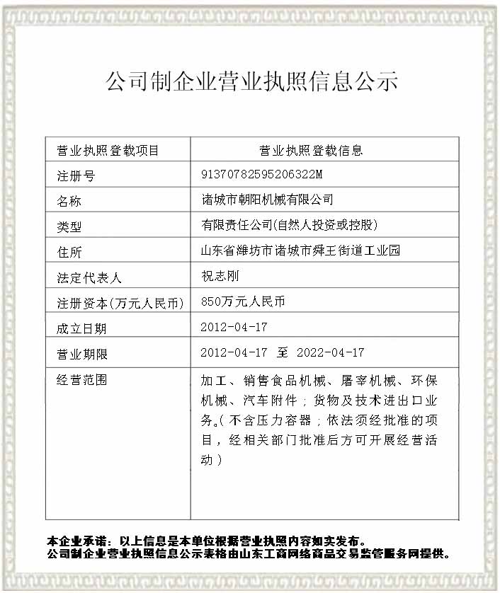 諸城市朝陽(yáng)機(jī)械有限公司是一家集家禽屠宰設(shè)備、家禽屠宰流水線(xiàn)研發(fā)生產(chǎn)和設(shè)計(jì)銷(xiāo)售于一體的生產(chǎn)制造商。公司具有較完善的設(shè)計(jì)、研發(fā)、檢測(cè)和售后體系,并且具有雄厚的技術(shù)力量,超前的工藝設(shè)計(jì)水平,完善的屠宰設(shè)備和完善的安裝水平,是國(guó)內(nèi)家禽屠宰機(jī)械行業(yè)代表性企業(yè)。